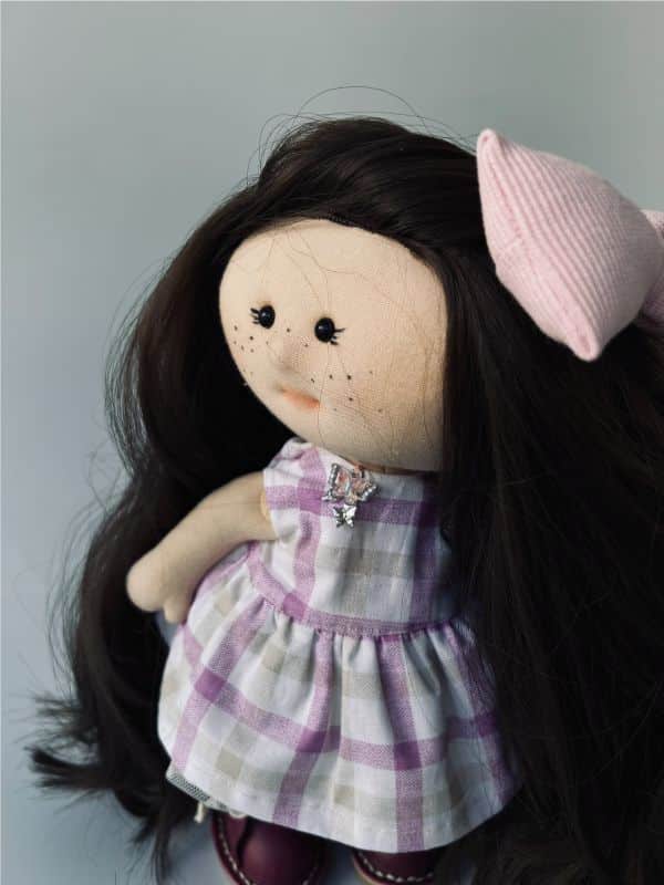 Maria Helena representa o verão em toda a sua alegria. Seu vestido rosa traduz calor e afeto, enquanto seus longos cabelos escuros e soltos dão movimento à sua presença encantadora. Com um toque de espontaneidade e muito charme, ela transmite leveza e energia, como um fim de tarde ensolarado. Feita com tecido percal e cotton, enchimento de fibra siliconada e cabelo de fibra sintética.