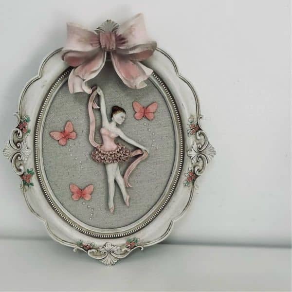 Quadro delicado com aplique em resina sobre tecido de linho, trazendo a figura de uma bailarina rodeada de borboletas em tons suaves. Um detalhe cheio de graça e feminilidade para compor a decoração do quartinho.
