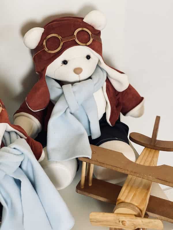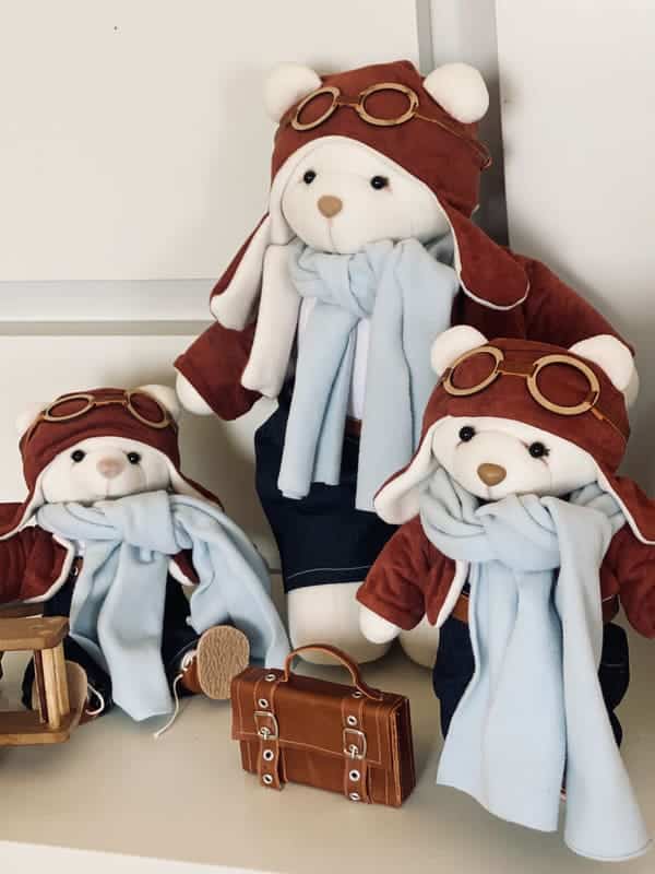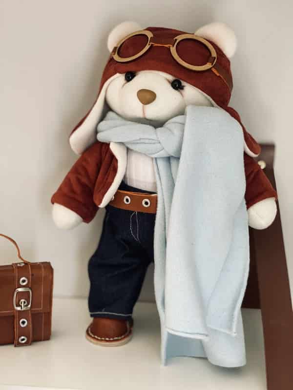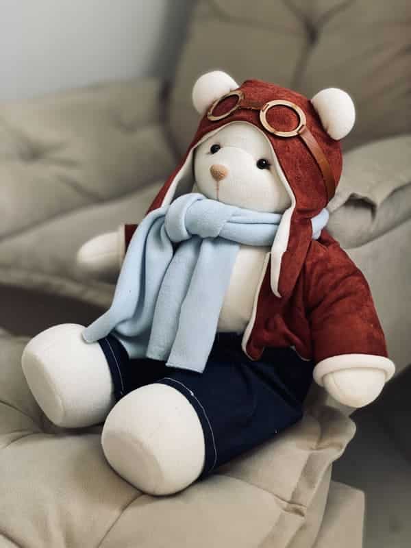 Com olhar sonhador e traje de aviador, este ursinho está sempre pronto para novas aventuras. Ele veste jaqueta, cachecol azul claro, calça jeans e leva consigo uma charmosa maletinha artesanal, que o torna ainda mais especial.